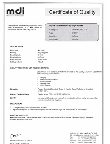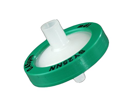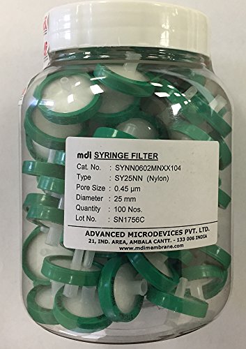 MDI SYNN0602MNXX104 Nylon Membrane Syringe Filter, 25 mm Diameter, 0.45µm Pore Size, Female Luer Lock Inlet x Male Luer Slip Outlet, Non-Sterile (Pack of 100)