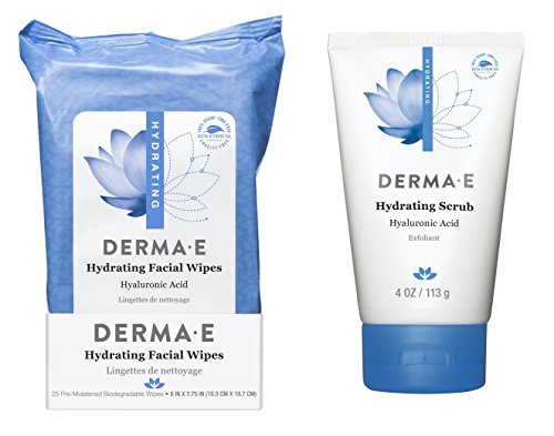 Derma E Hydrating Scrub: Buff away impurities and dull surface cells while moisturizing skin with this creamy exfoliant. Hyaluronic Acid, also known as nature's moisture magnet, promotes healthy skin hydration. Walnut Shell Powder provides gentle yet effective exfoliation, lifting away dirt, excess oils and dullness. Vitamin A encourages skin renewal, revealing smooth, vibrant, younger-looking skin. Use twice a week to reveal soft, smooth, luminous skin. 100% vegan, cruelty-free, paraben-free, sulfate-free, mineral oil-free, lanolin-free, gluten free, GMO-free. Derma E Hydrating Facial Wipes: Quickly and conveniently lift away makeup, oil and impurities while thoroughly hydrating, softening and smoothing skin with Hydrating Facial Wipes. Each freshly scented pre-moistened wipe is infused with ultra-moisturizing Hyaluronic Acid that helps condition, soften and smooth skin, leaving it fresh and dewy. Fortified with superfruit extracts Grape Seed and Maqui Berry, these easy, one-step wipes offer antioxidant protection while keeping skin clean and refreshed. Plus, each wipe is 100% compostable and all outer packaging is 100% recyclable. Hypoallergenic, dermatologist tested and sensitivity tested.Feature