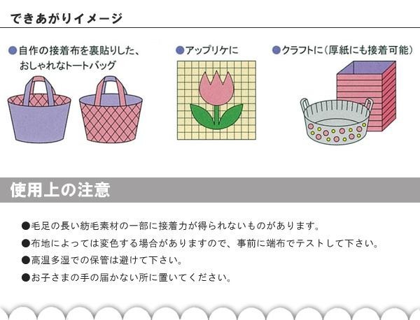 | 仕様 | 【主な用途】 バッグやポーチの裏貼り、リバーシブル生地作成、アップリケ、クラフトのデコレーション、裾上げやしつけのかわりに 【適応素材】 薄手~中肉素材 【接着樹脂量】 15g/m2 |