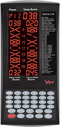 -. Feature : Brings all of the exciting games you find with electronic dartboards, and makes them available for steel tip dartboards / Features a large, backlit LCD monitor that can easily be seen from the throw line / Fun for up to 8 players, with 40 games to choose from and 655 game options, including setting custom handicaps / Designed with an auto-off mode and a sleep mode to help save battery power; The soft keypad allows for clear and easy operation / Measuring 5" L x 1.5" W x 10.25" H, the Viper ProScore is battery operated, which requires 3 AA batteries (not included)