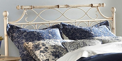 - Feature : King headboard with garden-gate styling and antiqued coloring; 52 inches high / Ball finials, twining horizontal lines, spindles, arches, and rolling pin top rail / Crafted from iron for durability, substance, and vintage feel / Crème Brulee finish has off-white base, brown highlights, and crackle patches / Available in full, queen, and king sizes; backed by 10-year warranty