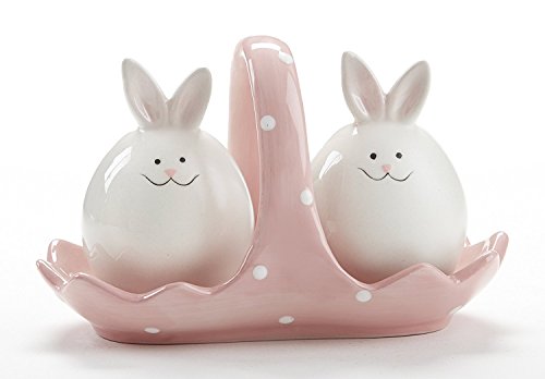 Easter Bunnies Ceramic Salt and Pepper Shakers in Pink Polka Dot Tray