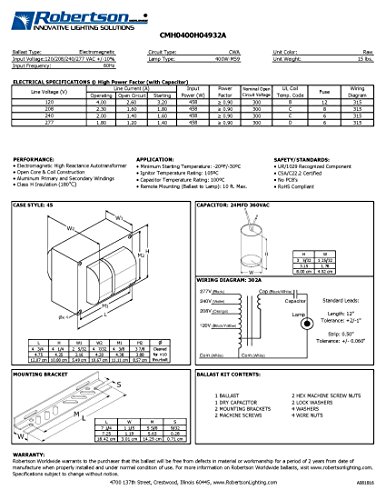 ROBERTSON 3P10040 HID CWA mHID ballast for 1 400 Watt, M59 Metal Halide Lamp, 120/208/240/277Vac, 60Hz, Normal Ballast Factor, HPF, Model CMH0400H04932A (Replaces Model CMH0400H04932)