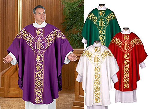 Studio : AT001 Publisher : AT001 Binding : Jewelry Product Description The Roma Chasuble is fully embroidered on the front and back. The workmanship on this chasuble is rich with densely stitched fine gold thread. This is an incredible value! Fully Embroidered Front and Back Exclusive embroidered IHS design Double hem-stitched for durability Tailored for a beautiful drape Fully lined with fine polyester satin - 49 1?2" L Includes matching inner stole Available in the most popular Liturgical colors Please specify Green, Red, Purple or White when ordering. -- Lined Polyester 0