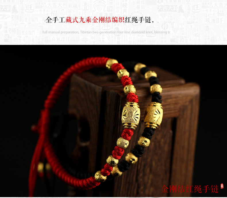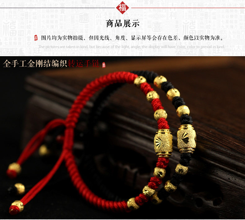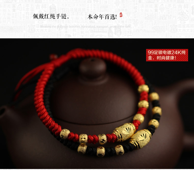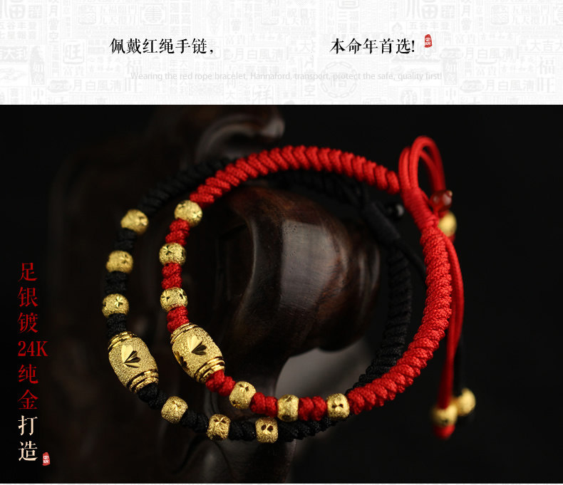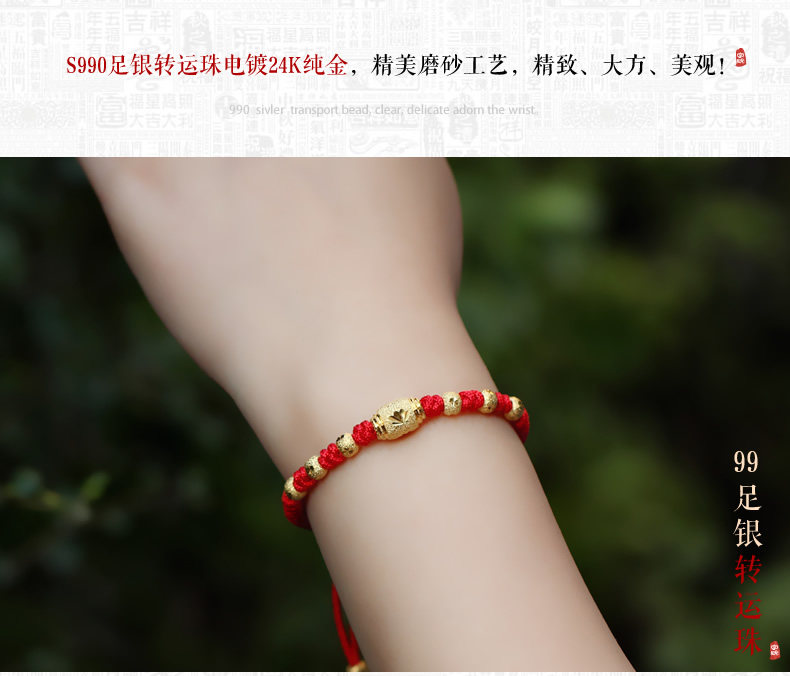 99足银电镀24k黄金红绳手链女男转运珠情侣猴年本命年新年礼物