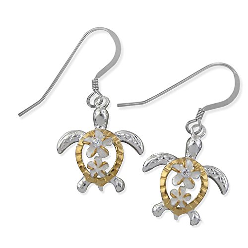 Sterling Silver with 14kt Yellow Gold Plated Accents Petroglyph Turtle Plumeria Dangle Earrings
