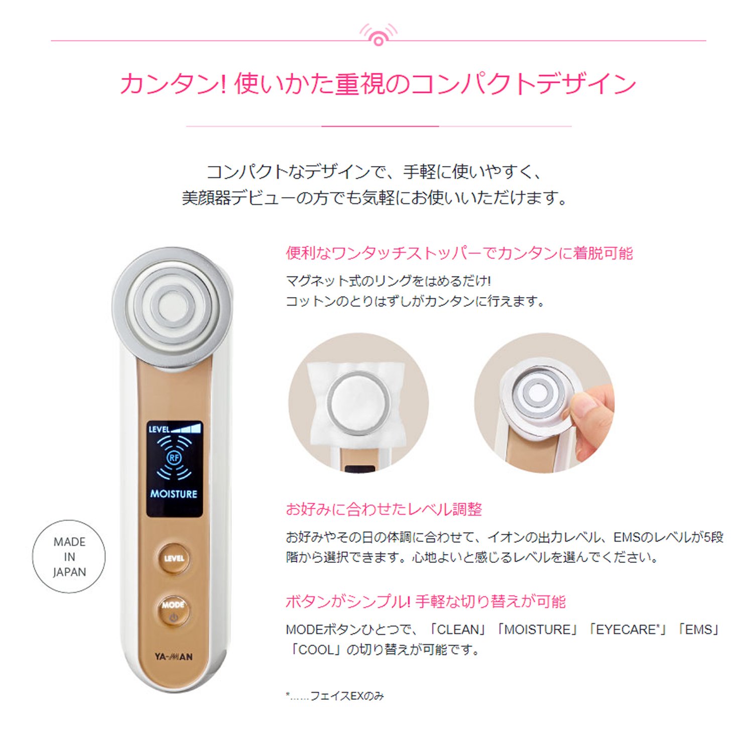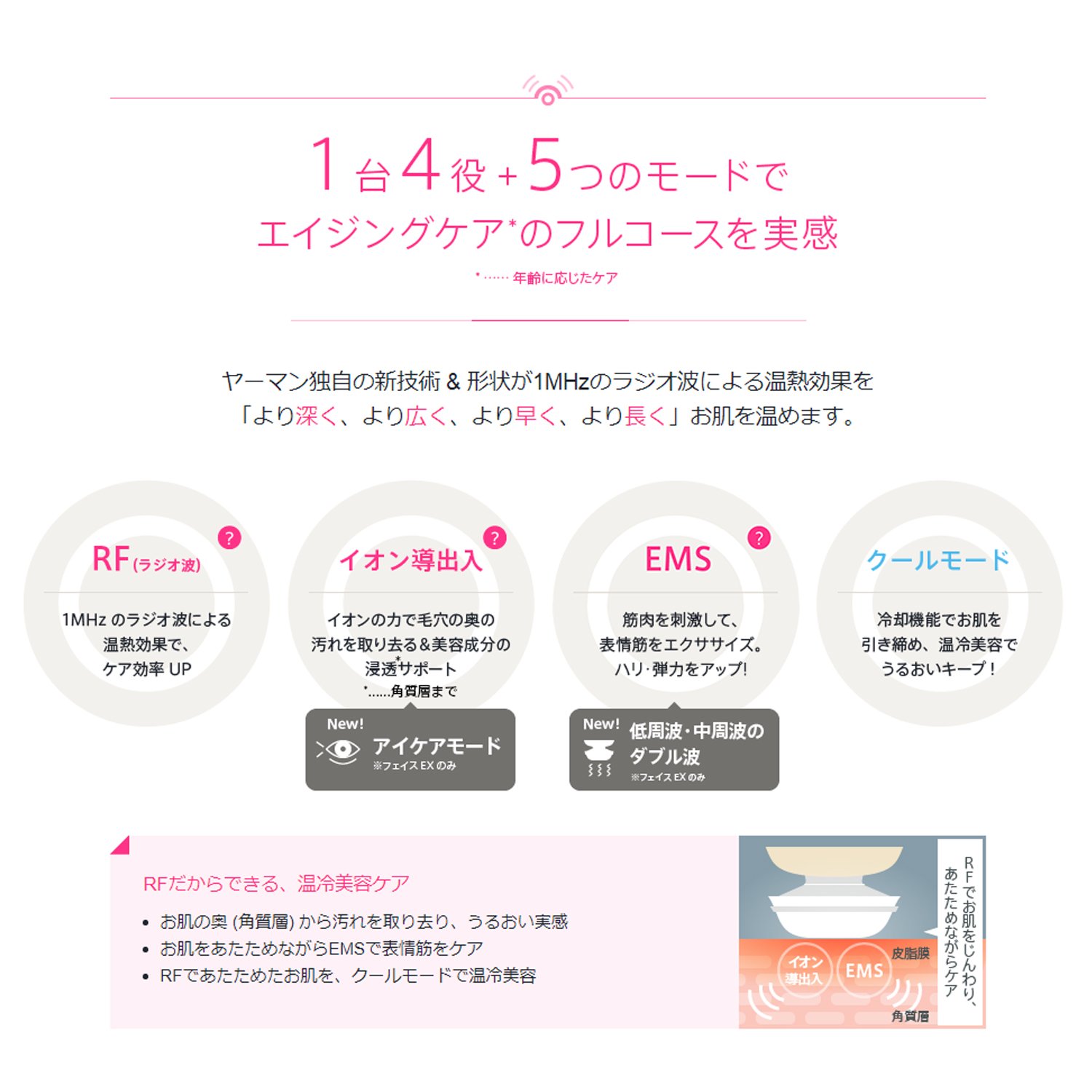 It is an all-in-one facial care equipment that takes care of skin conditions by 1 MHz "radio wave" which is also adopted in the esthetic salon, followed by "ion introduction / output", "double wave EMS", "cooling".