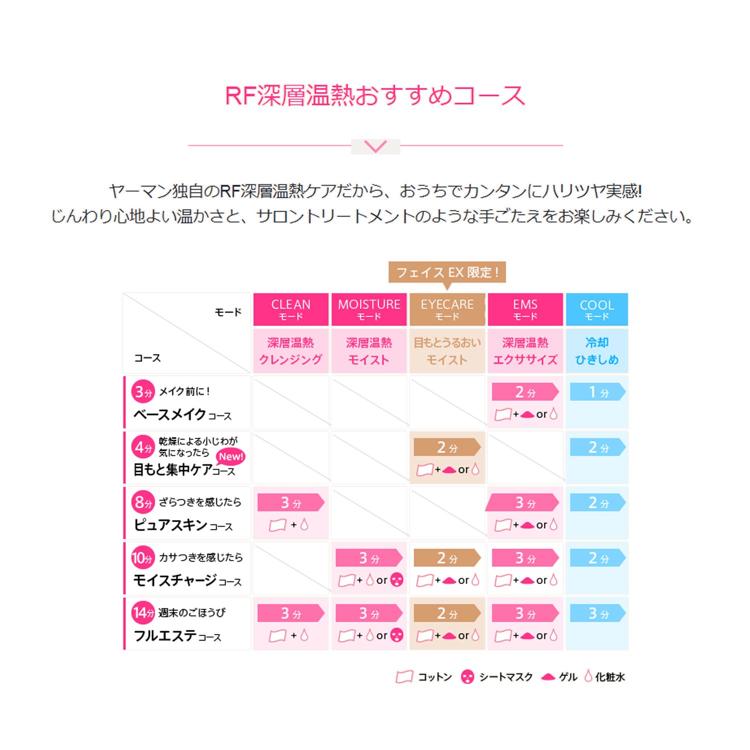 With this one, we realize cleansing, moisturizing, eye care, facial muscle training and full course of tightening.