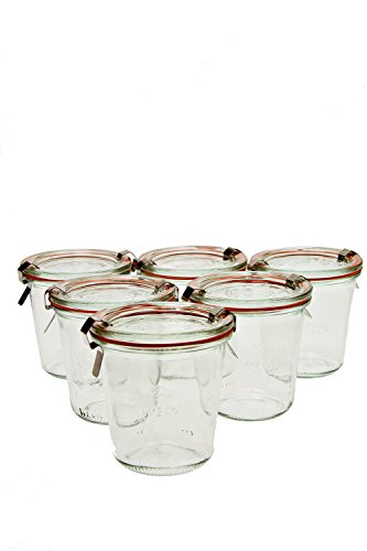 Weck 900 - Store foods in classic style with this distinctive glass jar embossed with Weck's famous strawberry logo. Jars are stackable for space-saving storage and feature wide mouths for easy filling. BPA free. Dimensions: 3½" x 3½". Capacity: 9.8 oz. 1/5 L Mold Jar (tall). Includes: 6 Jars, 6 glass lids, 6 rings & 12 clamps. Height: 3 1/2" Opening: 3 1/8" Volume: 9.8 fl oz. Dishwasher and microwave safe.