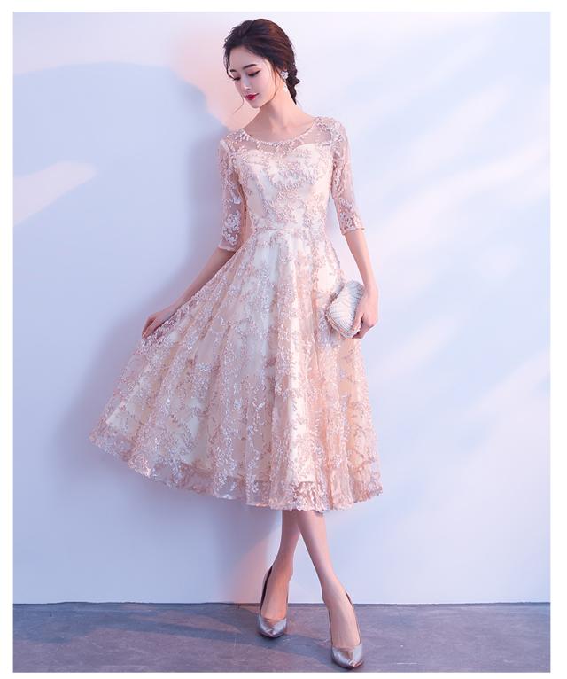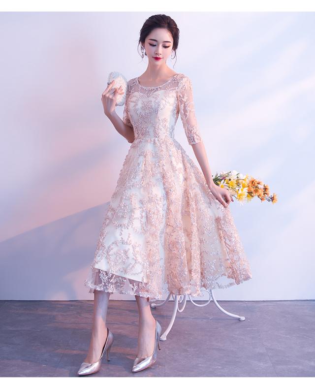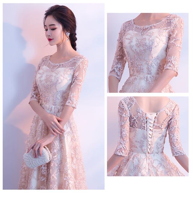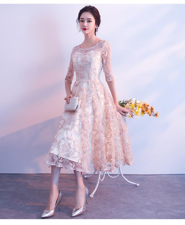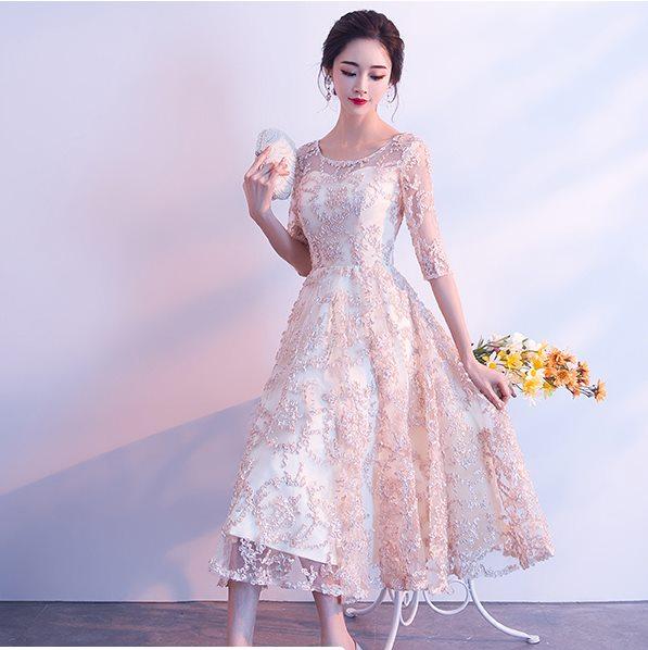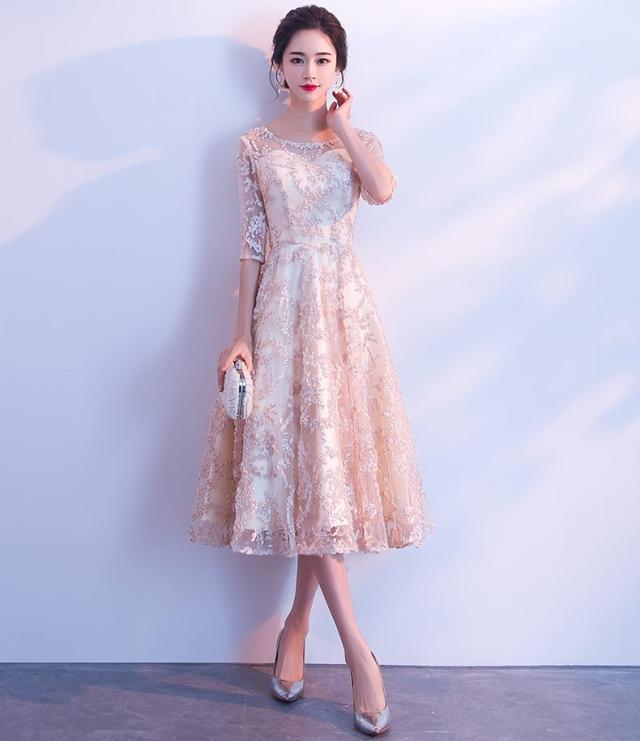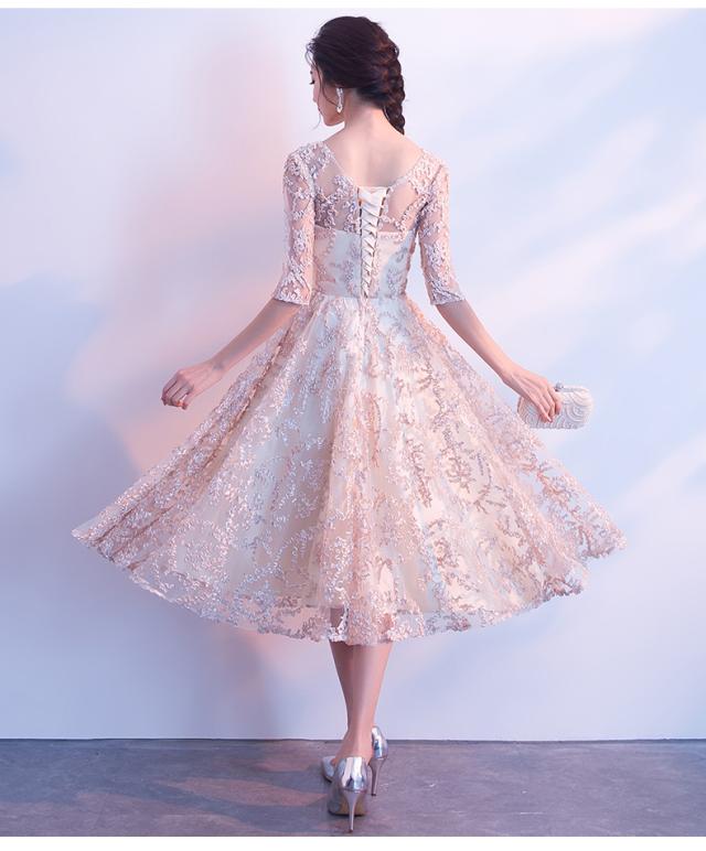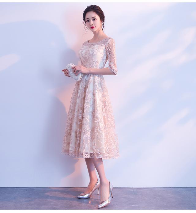 上品なレース素材で作られたフレアシルエットのパーティードレス