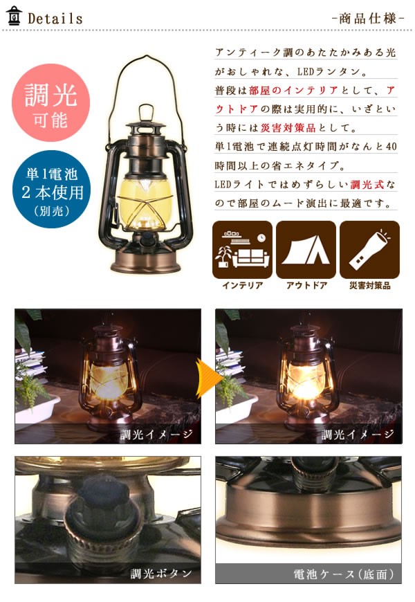 | 高輝度LEDライト使用のアンティーク風ランタン。 |