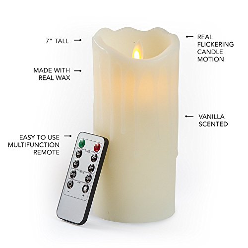 SPECIFICATIONS - Candle size 7 inches Height x 3.25 Diam. / Package contains one (1) candle with one (1) remote / Candles run on two AA batteries (not included) / Made with real high quality wax and feels and looks like a real candle. Candles are lightly vanilla scented.