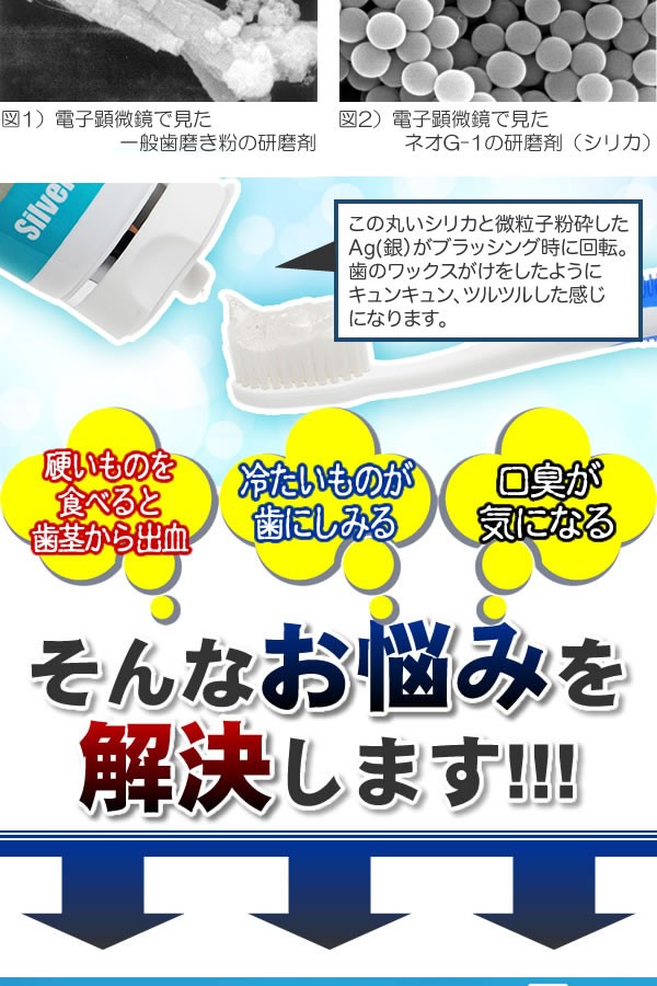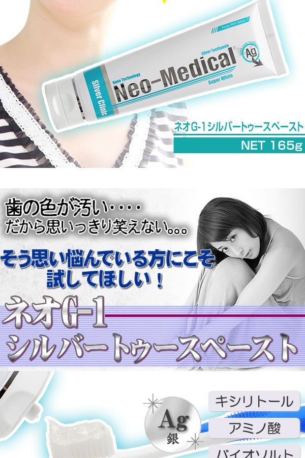 | <h1>輝く笑顔、輝く白さ!オーラル・デンタルケアならネオG-1シルバートゥースペースト。 歯みがき/はみがき/デンタルケア/オーラルケア/口腔ケア/口臭予防/虫歯予防/爽快/歯みがき粉/色素沈着/銀/キシリトール/アミノ酸/バイオソルト</h1> |