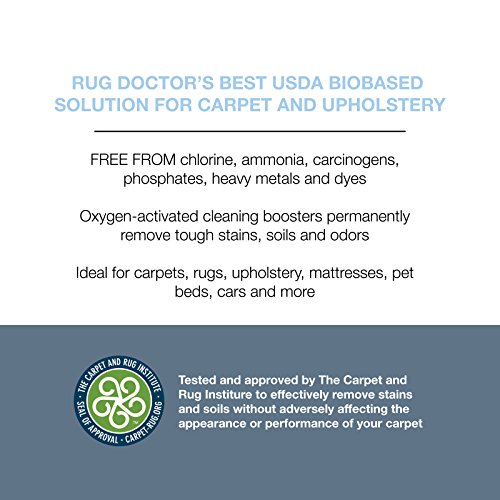 -. Feature : Cleaning detergent works to deep clean carpets, mattresses, couches, upholstery, car interior, drapery and more. / Biobased ingredients are free from harmful chemicals such as chlorine, ammonia, carcinogens, bleaches, phosphates, alcohol, heavy a metals or dyes. / High quality results renew carpet with bright and fresh results. / Safe to use with any deep carpet cleaning machine! For best results, use with the Rug Doctor Deep Carpet Cleaner, Portable Spot Cleaner, or Mighty Pro X3. / Removes dirt, pet urine, mud, oil, coffee spots, food and other set in stains.