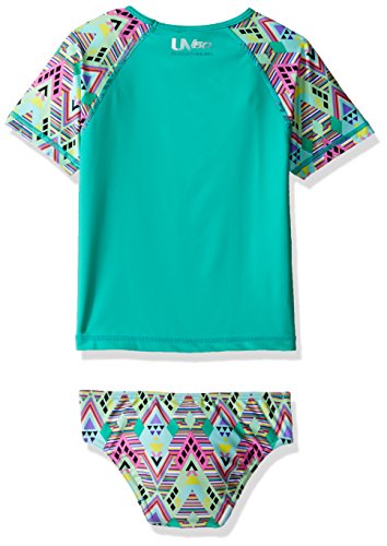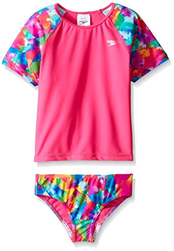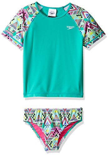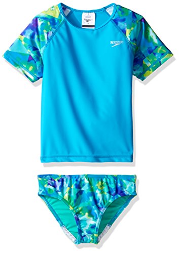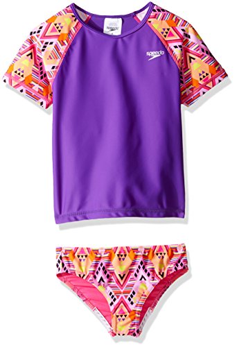 This two-piece set has everything she needs for fun in the sun: a rash guard top with colorful printed sleeves, and coordinating bikini bottoms featuring Speedo "no wedge" technology for stay-put comfort. Both pieces resist the harsh effects of chlorine and feature built-in sun protection to protect sensitive young skin.Feature