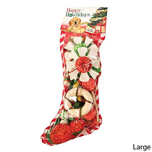 -. Feature : Each stocking includes various holiday themed rawhide treats including, bones, canes, lollipops, sticks and flowers in both compressed and standard rawhide for a mixture of holiday fun. / Large Stocking has 25 pieces.
