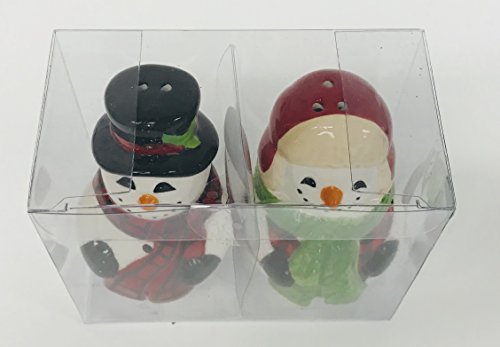 Happy Snowmen | One Snowman With Black Hat & Gloves & Red & Black Scarf | One With Green Scarf & Red Winter Hat Ceramic Salt & Pepper Shakers Set