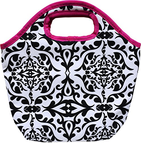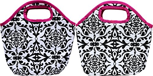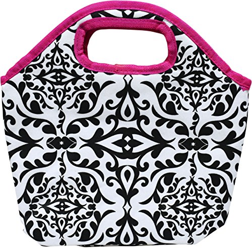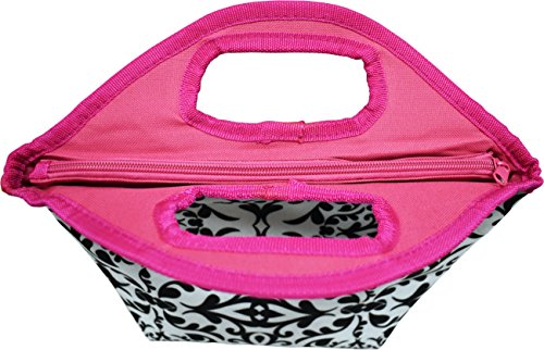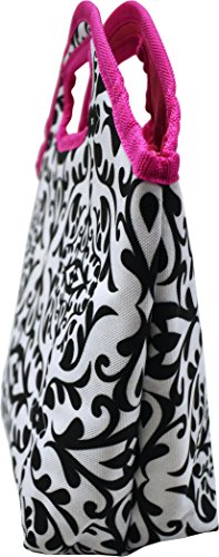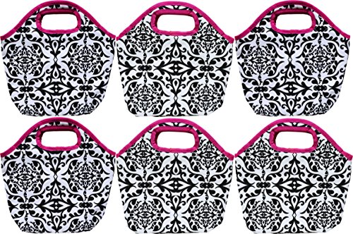 Set of 6 Black and White Damask Lunch Bags! Reusable Lunch Boxes - Zipper Topped - Lined Stylish Lunch Totes Insulated for keeping Food Hot or Cold! (6)