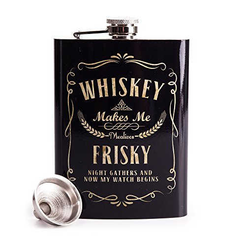 -. Feature : Come with a 8 ounce flask and a free funnel / STYLISH & DISCREET: flask printed with '' Whiskey make me Frisky" and is a must-have collectible for any world traveler or digital nomad. 8 oz is the perfect balance between getting you tipsy and still fitting in your pocket for discreet carry! / LIGHTWEIGHT SLIM DESIGN - Easily fits in your pants pocket or purse. Screw Down Cap Attached to the Flask so it Cannot be Lost. / PERFECT GIFT for any Occasion or Holiday including; Bridal Parties, Graduation, Father's Day, Parties, Sporting Events, Cookouts, the Golf Course, Camping, Road-trips, that hard to shop for person in your life, or just treat yourself (perfect for anywhere you'll need a quick 'pick-me-up'). / RUST RESISTANT: BPA free and FDA approved steel provides your drink a contaminant free environment