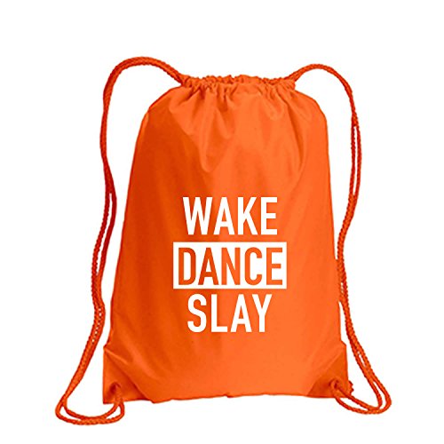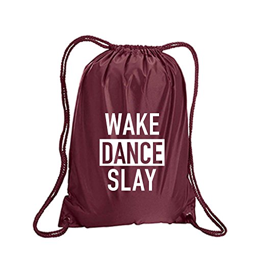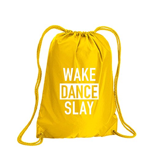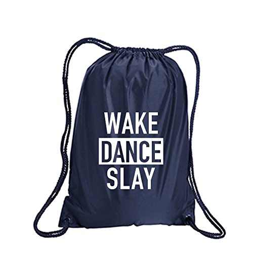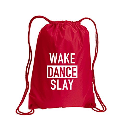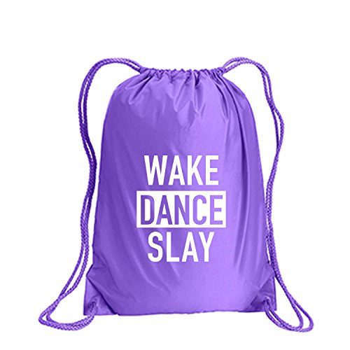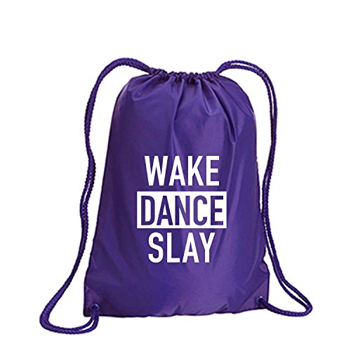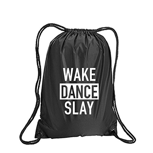 Product Description This durable and stylish nylon tote features "WAKE DANCE SLAY" on a cinch pack tote with white ink. Bag comes in small and large sizes and is made of a durable 210 Denier nylon and has color-matched draw cords. Printed in the USA on an imported bag. 0