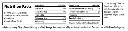 Does it contain caffeine?Yes, each half-teaspoon (1g) serving contains roughly 34mg of caffeine, about 1/3 a cup of coffee. However, Matcha also contains L-Theanine, which has a calming and leveling affect, so it doesn't make you feel jittery or wired like coffee does.