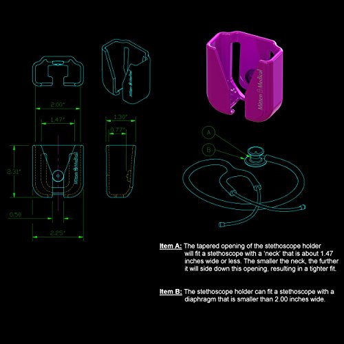 -. Feature : Three pack includes: one pomegranate, one turquoise, and one fuchsia color stethoscope holder. / Scrub-Lock: Exclusive Mitten Medical Scrub-Lock friction pad prevents the clip from falling off your scrubs. / Reduces strain on neck: Designed to be worn on belts, scrub waistbands or shirt pockets. Prevents natural skin oils from breaking down the tubing on your stethoscope / Durable: Will withstand daily wear and fall damage. Easy to Clean. Fits most stethoscopes. / Great for: Nurses, Physicians, Respiratory therapists, Veterinarians, Students, and all other medical professionals