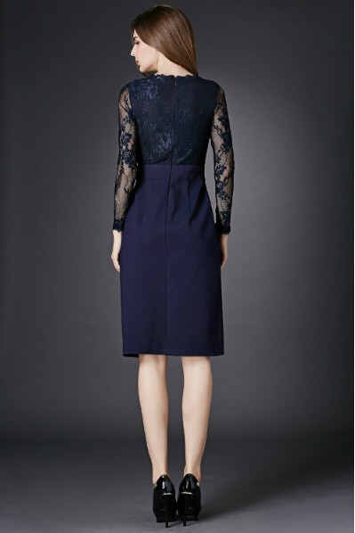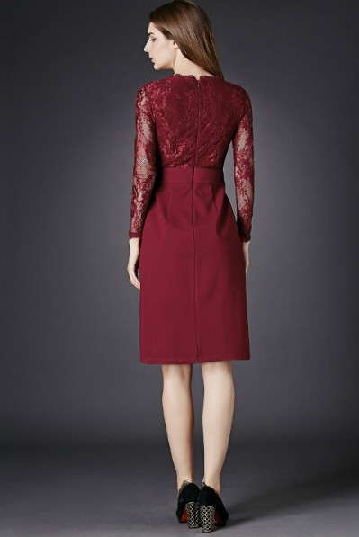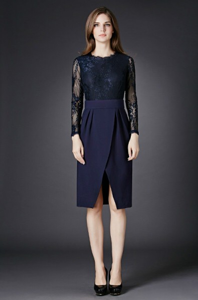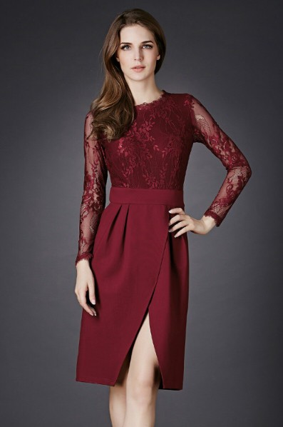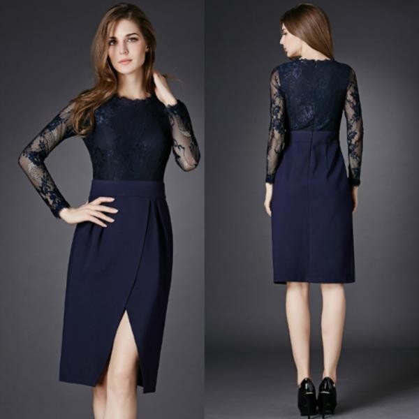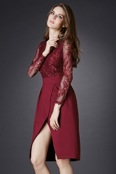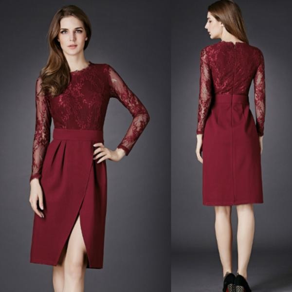 セクシー ハイウエスト切替 長袖 レース スリットワンピース