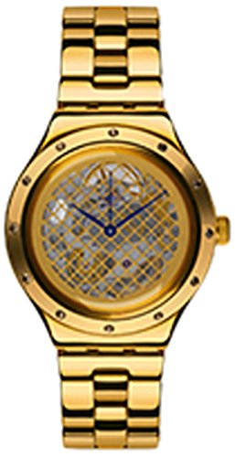 Gold-tone stainless steel case and bracelet. Fixed gold-tone bezel. Skeleton dial with blue hands. No markers. Dial Type: Analog. Automatic movement. Scratch resistant mineral crystal. Pull / push crown. Skeleton case back. Case size: 37 mm. Case thickness: 12.50 mm. Round case shape. Band width: 15 mm. Fold over clasp. Water resistant at 30 meters / 100 feet. Functions: hour, minute, second. Dress watch style. Swatch Boleyn Automatic Skeleton Dial Unisex Watch YAG100G.Feature
