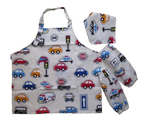 -. Title : こども キッズ用 防水 エプロン 裏地付き アームカバー 三角巾 セット 自動車 くるま ホワイト