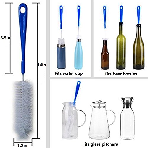 - FLEXIBLE AND LONG : The brush head is FLEXIBLE (not stiff) and extra LONG at 14" and1.8" wide. Makes it easy to reach all sides of the bottle with less effort. You can clean Swell, plastic, bird feeders and other bottles, jars, carboys and anything with small tight openings.