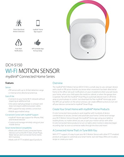 Get alerted when motion is detected at home. Plug in the motion sensor with mydlink Smart Plugs and turn on or off lights, fans, music and more when motion is detected. Connect your mydlink camera and it will begin recording when motion is detected so you’ll always know what’s going on at home. Be aware of what’s happening at home even when you’re away. Get push or text notifications on your smartphone when motion is detected at home: when your pet leaves your home, when your child opens the medicine cabinet, or when the garage door is opened. Have better control of your home.Feature