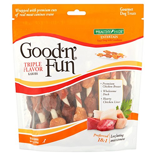 -. Binding : Misc. -. Brand : dog treats -. Color : Multicolor -. EAN : 0715658264925 -. Feature : Preferred 18:1 over other combination chews / Decadent, Gourmet dog treats are made with premium chicken, wholesome duck and hearty liver. / Wrapped with premium cuts of real meat that canines crave / These uniquely shaped treats provide long lasting entertainment -. Label : Kardin -. Manufacturer : Kardin -. Model : 82245H-H® -. MPN : 82245H-H® -. PackageQuantity : 1 -. PartNumber : 82245H-H® -. ProductGroup : Pet Products -. ProductTypeName : PET_SUPPLIES -. Publisher : Kardin -. Size : 12 oz -. Studio : Kardin -. Title : Healthy Hide Good n Fun Triple Flavor Kabobs Gourmet Dog Treats, 12 oz. Preferred 18:1 -. UPC : 715658264925