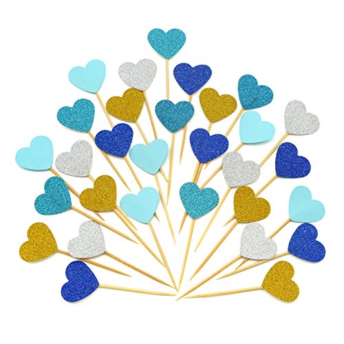 Cupcake Toppers 30Pcs Set, GUGUJI Funny Heart Glitter Mini Birthday Cake Snack Decorations Picks Suppliers Party Accessories for Wedding and Baby Birthday (Blue Series)