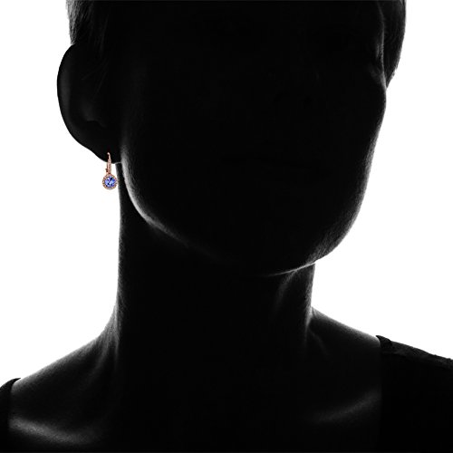 Drop earrings feature 6mm round shaped tanzanite gemstones surrounded by smaller white topaz stones. They are secured by lever-back closures.