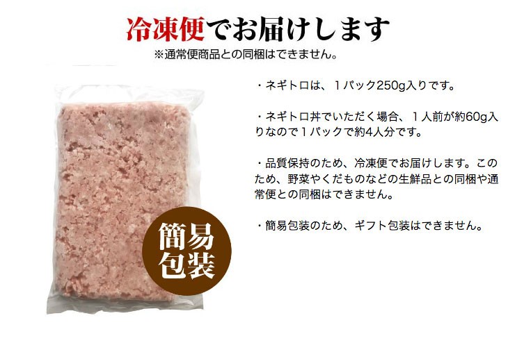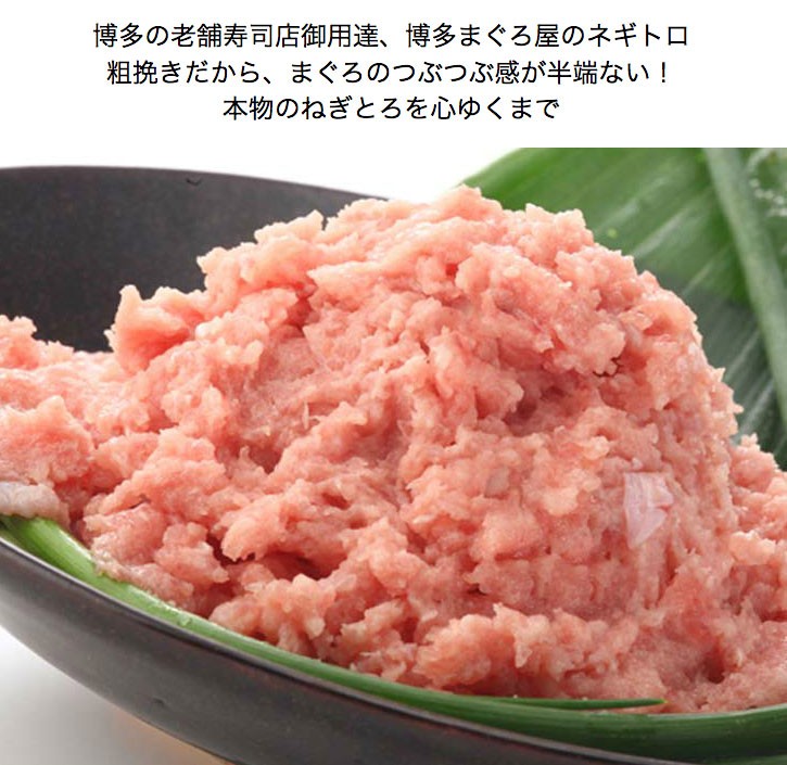 | 本来のネギトロとは、骨の隙間にある赤身(中落ち)や、 筋の多い部位や皮の裏などの脂身をこそげ落としたもの(すき身)のことであるため、 本マグロを1本丸ごと買い付けるような店でしか出ない寿司種だったそうです。 お届けするネギトロは、博多の老舗寿司店や有名ホテルにも納めている博多まぐろ屋さんが、 高級まぐろを粗挽きミンチにしたもの。 ねぎとろの鮮度を保つために、出荷直前まで超冷温保存。 まぐろ独特のもちもち感、あっさり感、ぷりぷり感を、 心ゆくまで味わえる贅沢ねぎとろです。 |
