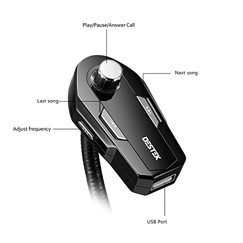 Do you want to get rid of wires to play music at anywhere? Do you want double USB charging ports to charge your devices at same time? DESTEK ® Bluetooth FM transmitter is designed with advanced bluetooth and FM technology, integrates a good bunch of amazing functions, such as FM transmitter, hands-free calling, music playing, two extra charging ports. Besides, the flexible goose pipe further adds ease of use and convenience to this marvelous unit for car driving. It can turn music off when there is a call, after calling is over, it can auto play music again,so you can enjoy music and drive safely at the same time.