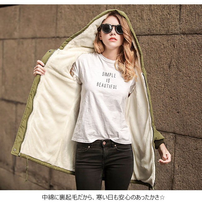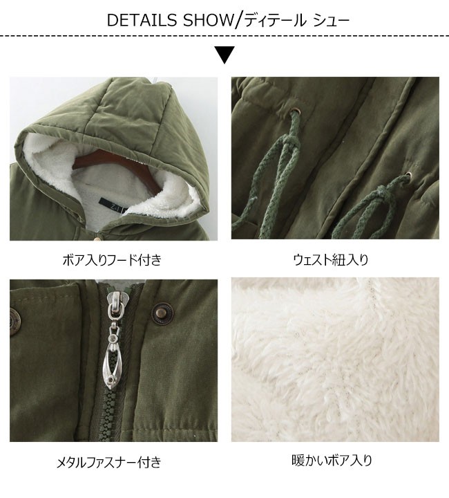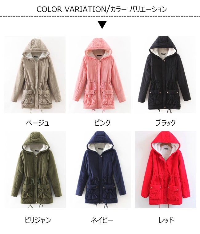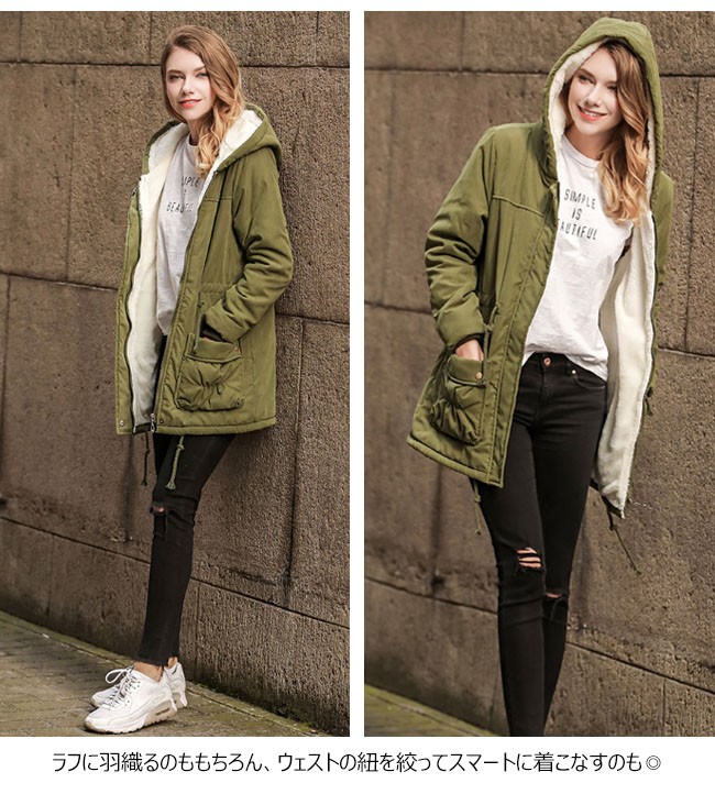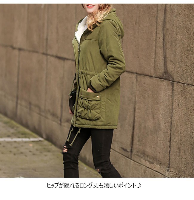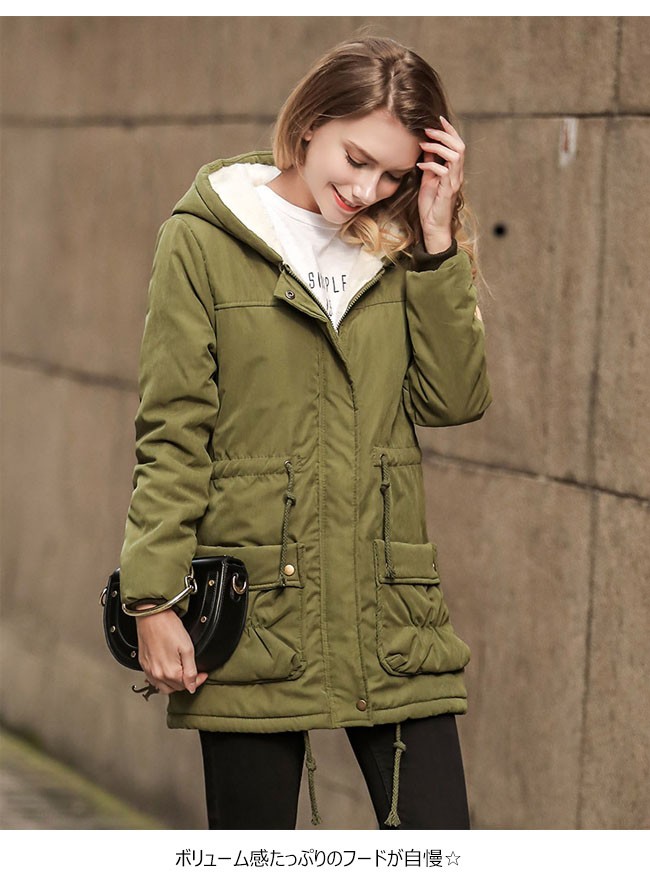 | 商品名 | 裏起毛コート 中綿コート 秋冬コート 秋冬アウター ミリタリーコート レディース 裏ボア 羽織り フード付き ジャンパー ロング丈 ウェスト紐入り 2017秋冬新作 |