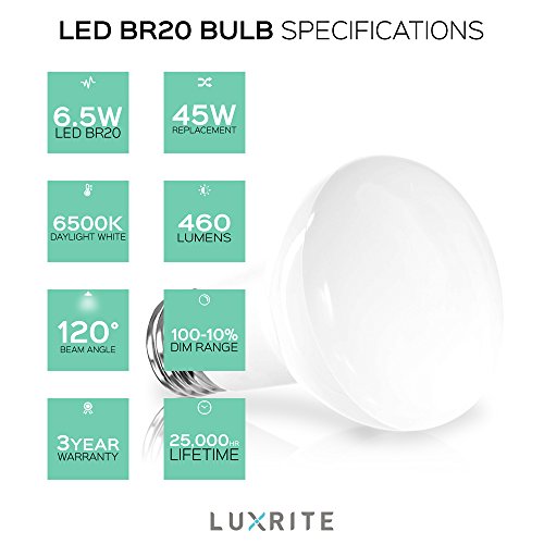 4-Pack R20 LED Bulb, Luxrite, 45W Equivalent, 6500K Daylight White, Dimmable, 460 Lumens, BR20 LED Flood Light Bulb, 6.5W, E26 Medium Base, Damp Rated, Indoor/Outdoor - Recessed and Track Lighting