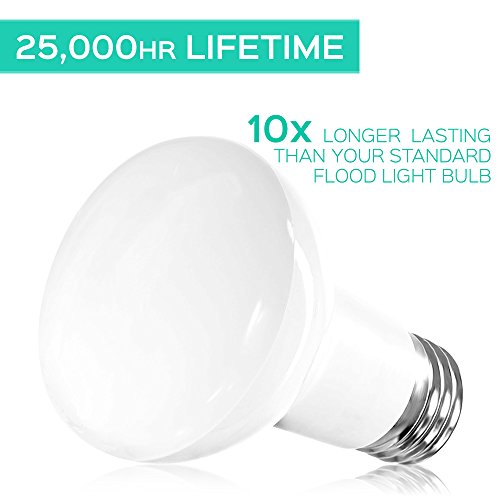 - LONG LASTING - Built with an astounding 25,000 hours of lifetime, no replacement will be needed for the next 22 years, when used 3 hrs/day. That means each R20 LED light bulb lasts 10x longer than the equivalent incandescent floodlight bulb.