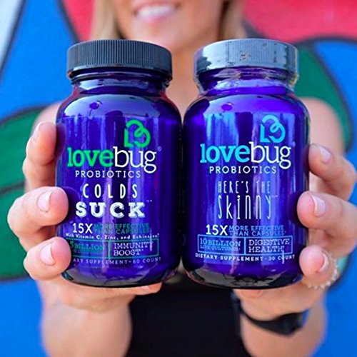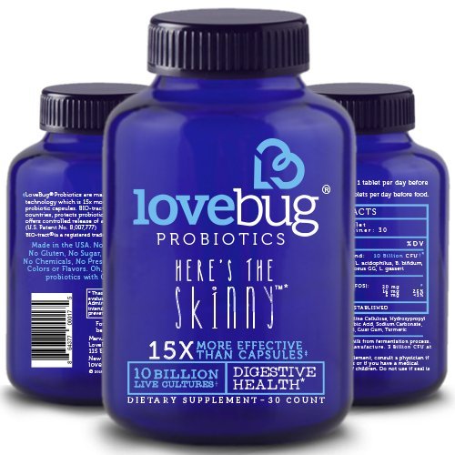 Contains (1) bottle, 30 tablets LoveBug Probiotics Here's the Skinny, probiotic supplement for digestive health support. Promotes healthy gut bacteria for support in weight loss, energy & mood, & digestive tract issues. Gluten free, non-GMO & no allergens.