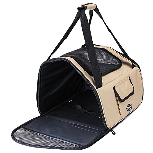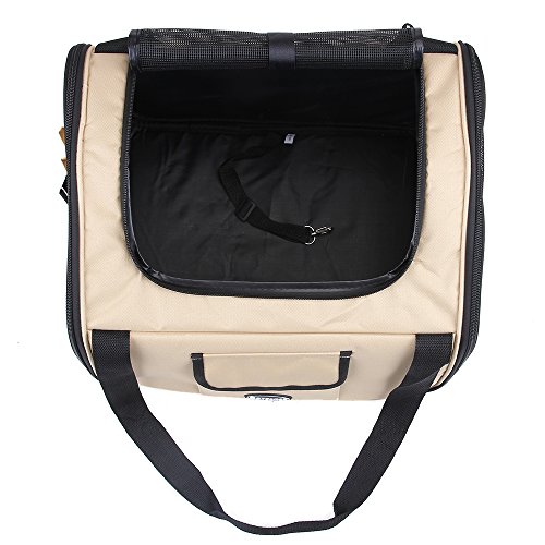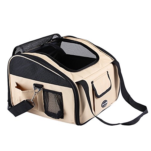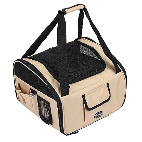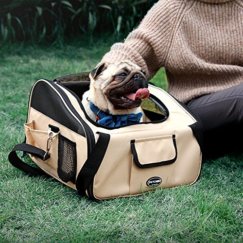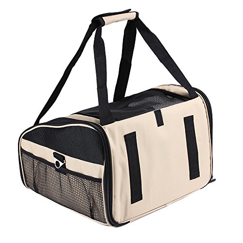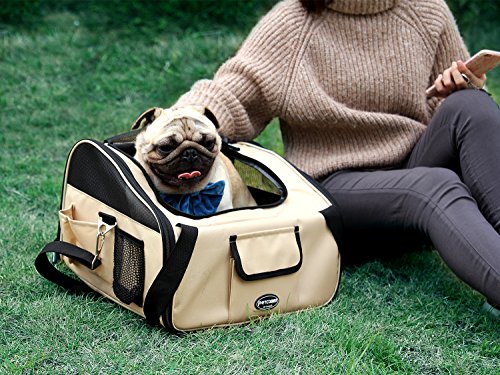 This 2 in 1 carrier perfectly performs as pet bag and car seat . Interior tether is adjustable to keep your pet secure. Loops at back allows safety belt to go through and fix. Adjustable strap attaches to headrest or play as shoulder strap while walking. Mesh top entry and side windows ensure air ventilation. Front and side pockets hold treat,toy,etc. Product Dimensions: L:16"L×13.5"W×12"H.Fit pets up to 20 lbs