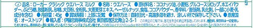 原材料:ココナッツ油、小麦粉、グルコースシロップ、ホエイパウダー、ぶどう糖、脱脂粉乳、大豆粉、全粉乳、大麦麦芽エキス、ヘーゼルナッツ、膨張剤、炭酸水素Na、ピロリン酸二水素二Na、食塩、乳化剤、ココアパウダー、香辛料、ブルボン種バニラビーンズ、香辛料その他