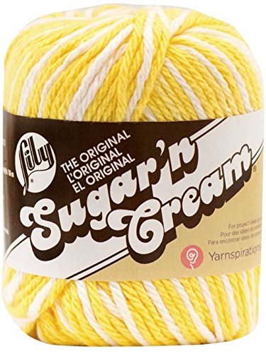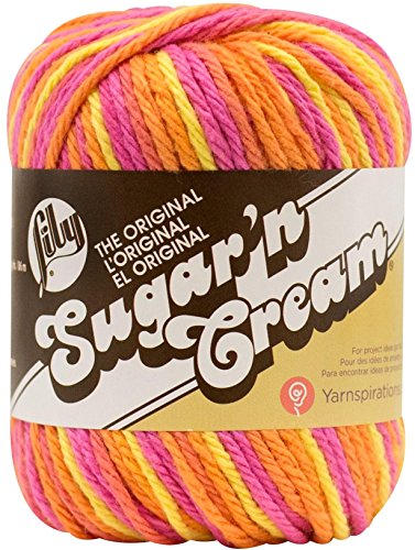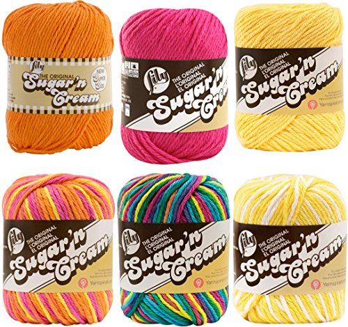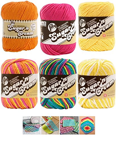 - 6 skeins of Lily Sugar 'n Cream yarn as shown. Popular for making dishcloths. Colors include Yellow, Hot Orange, Hot Pink, Daisy Ombre, Playtime and Psychedelic. Dishcloth patterns include Over the Rainbow, Brick Stitch, Garden Grows, and Mod Gingham.