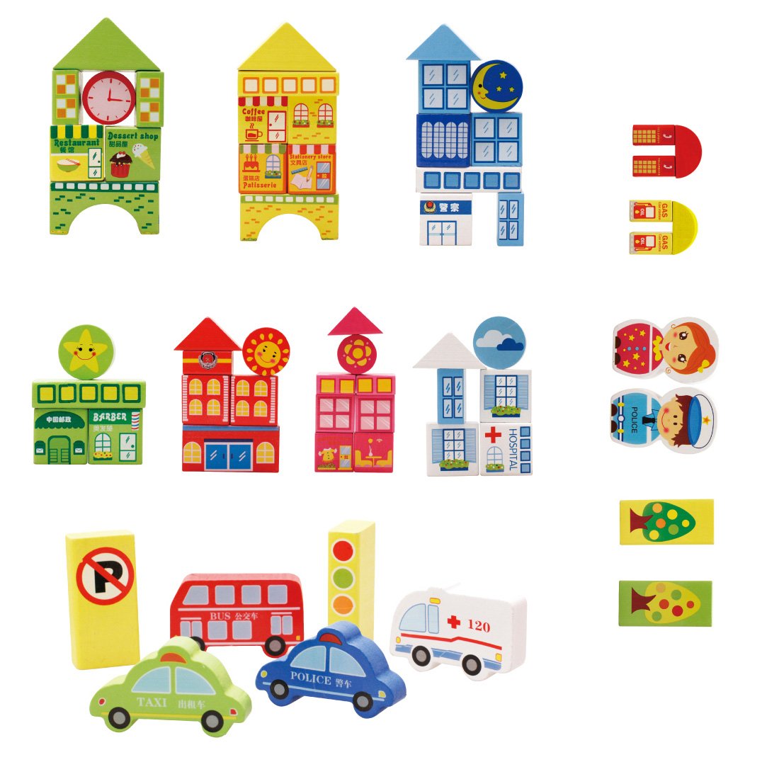 Includes: About 100 pieces of building blocks (car parts × 5, person parts × 2, weather parts × 4, English alphabet parts × 26, number parts × 5, town facility parts × 31, circular parts × 12, triangle parts ×