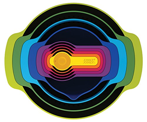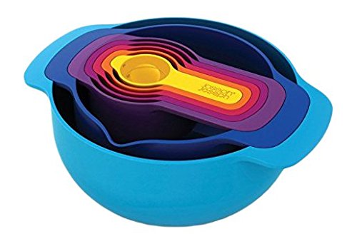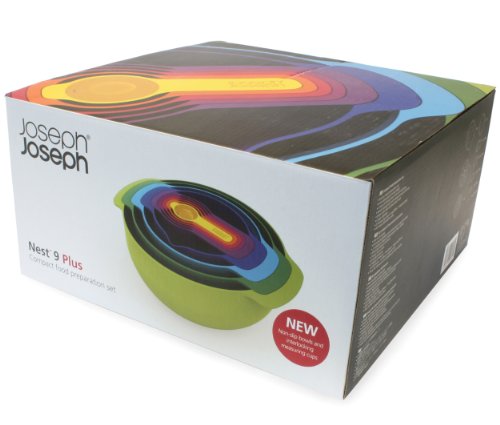 Nest 9 Plus is the ultimate collection of practical, space-saving kitchenware comprising a unique range of food preparation sets. The innovative design allows the individual elements within the set to be stacked neatly together, thereby occupying the absolute minimum amount of space. In this brand new updated design, mixing bowls now have large non-slip bases and wider carry handles. The small mixing bowl includes measurements inside for added convenience (milliliters / fluid ounces), and a spout for accurate pouring. The measuring cups have been redesigned to 'snap' together more securely and now feature an additional spoon in the center, allowing measurements from 1 teaspoon up to 1 cup to be made. A new improved stainless-steel mesh sieve and a large colander complete the collection of food preparation items. Nine-piece set includes 10.5-inch mixing bowl, 9-inch colander, 7.5-inch sieve, 6-inch bowl with measurements and spout, 1/4, 1/3, 1/2, and 1 cup measuring cups and 1 Tbls. Comes in stylish, boxed packaging. All pieces are dishwasher safe. By Joseph Joseph, masters of form and function.Feature