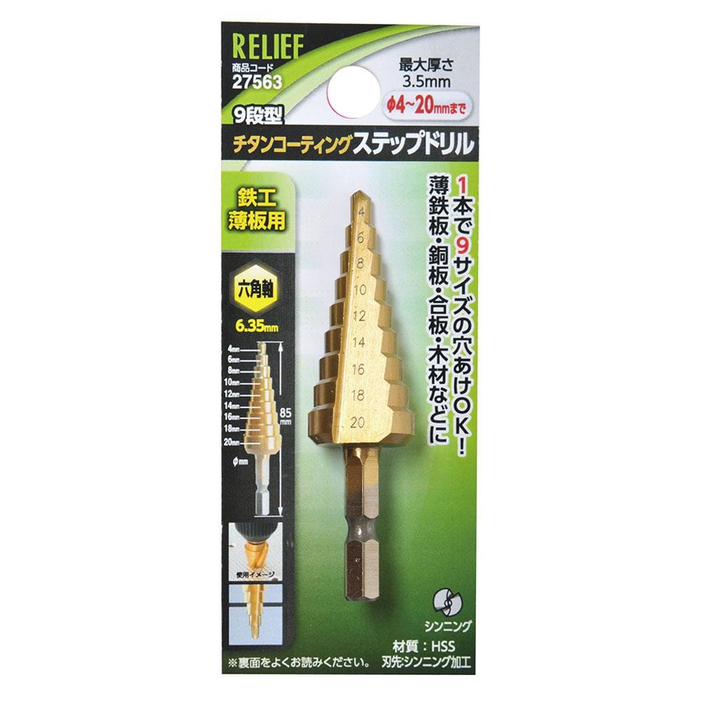 | 仕様 | 9段階穴あけ可能(Φ4・6・8・10・12・14・16・18・20mm) 最大穴あけ厚さ3.5mmまで 刃先:シンニング加工 六角軸:6.35mm |