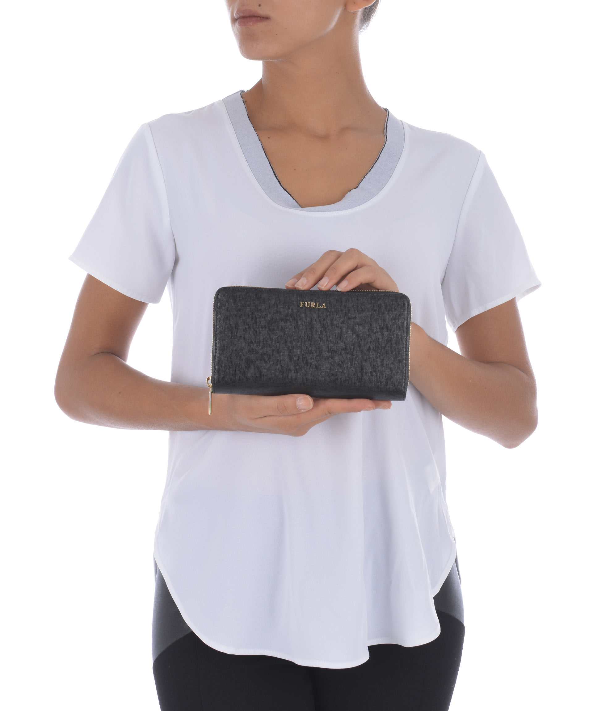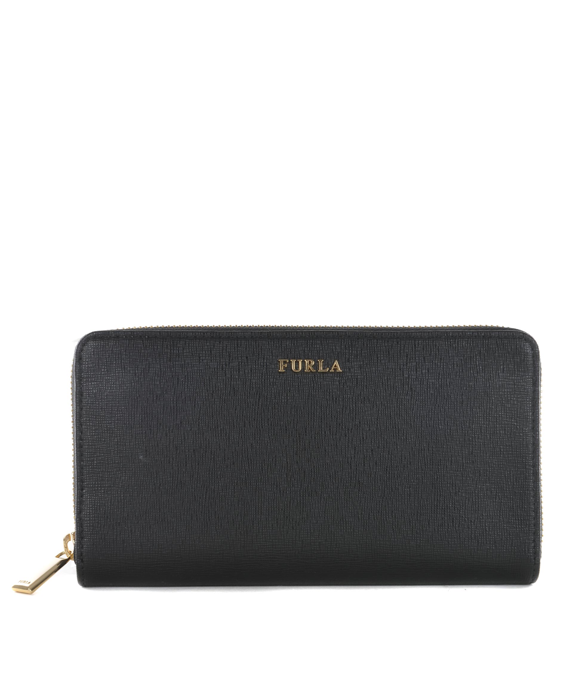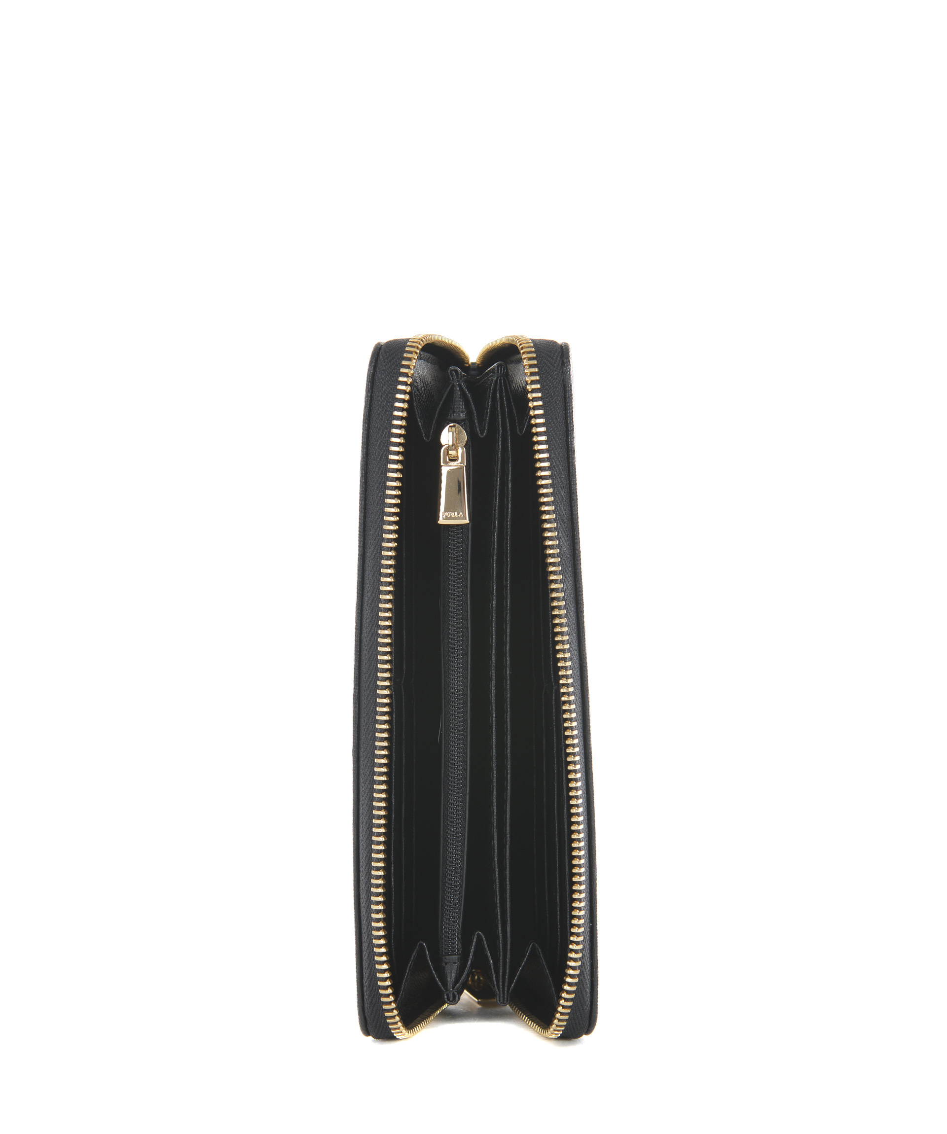 Portafogli Furla in pelle stampa saffiano Nero. Apertura con zip dorata. All'interno tasca centrale con zip, scomparti per banconote, tasche per carte di credito. Logo frontale in metallo dorato.