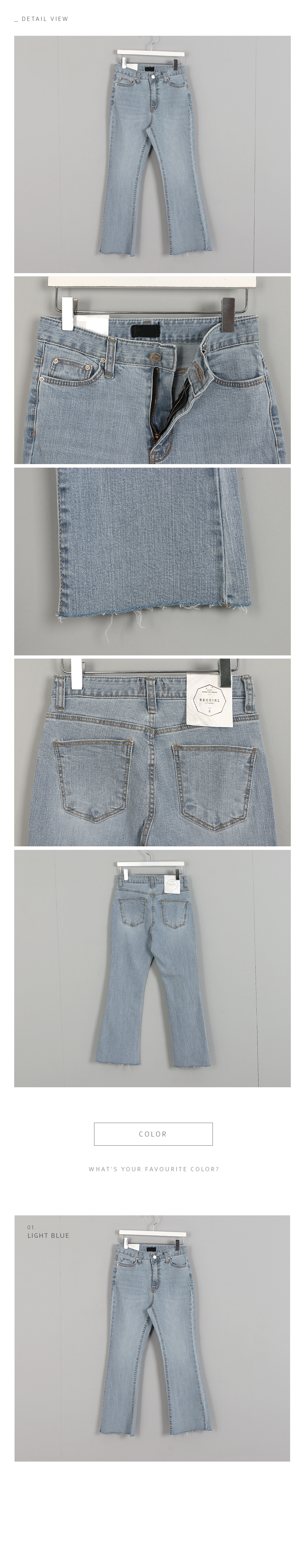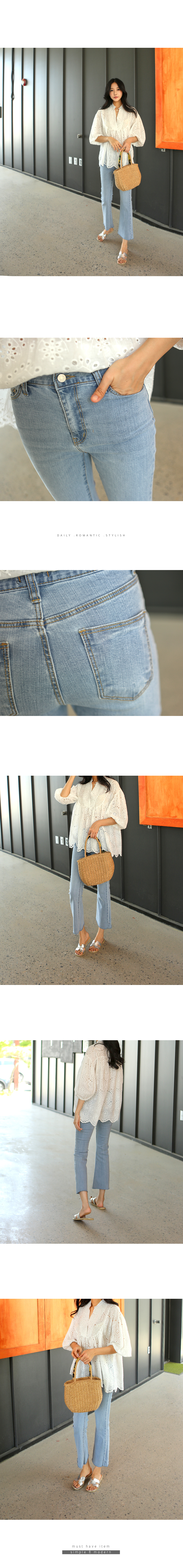 두껍지 않아 가벼운 코튼소재로스판혼방의 텐션감이 있어여름시즌 멋스러운 부츠컷 팬츠에요살짝 밝은 톤의 워싱은 블루그레이톤으로세련된 색감이 다양한 컬러와 코디하기 좋답니다탄탄하게 바디라인을 잡아줘 날씬해보여요허리 26 S사이즈의 모델이S사이즈는 타이트하게 입어주었고M사이즈 살짝 여유있게 편하게 입어주었어요색상은 라이트블루사이즈는 XS,S,M,L▼ 관련상품 : 코키 앤틱 자수 원피스플라워 펀칭 코튼 블라우스