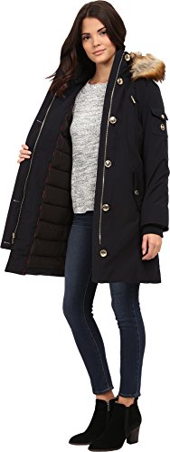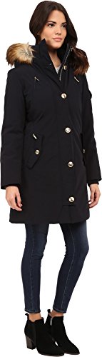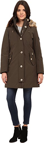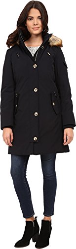 Poly-cotton outer shell offers light protection from the elements. Quilted lining boasts a lightweight down fill for added warmth. Removable hood features plush faux fur trim. Stand collar. Zippered chest pockets. Button-flap pocket featured on left sleeve. Long sleeves feature rib-knit inner cuffs. Zippered hand pockets with button-flap accent. Button-flap and zipper closure. Straight hemline. Lined. Shell: 85% polyester, 15% cotton;
