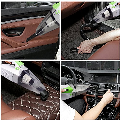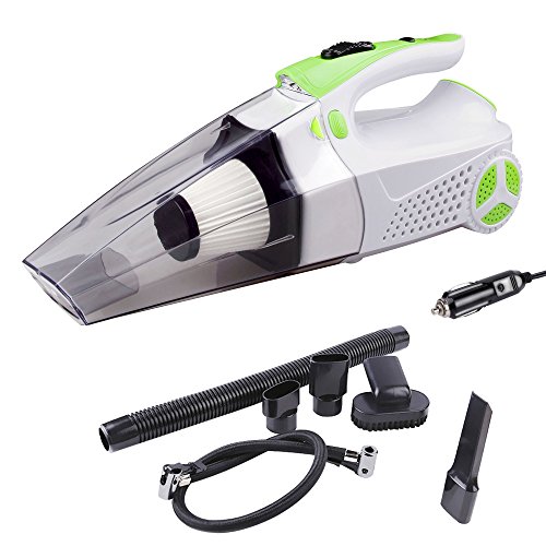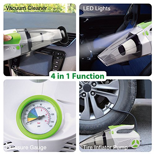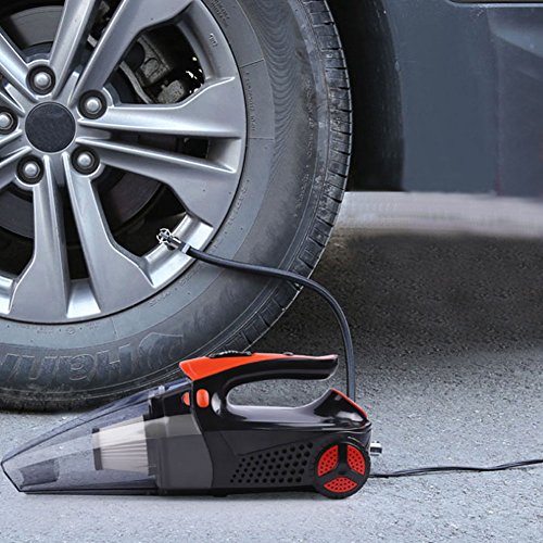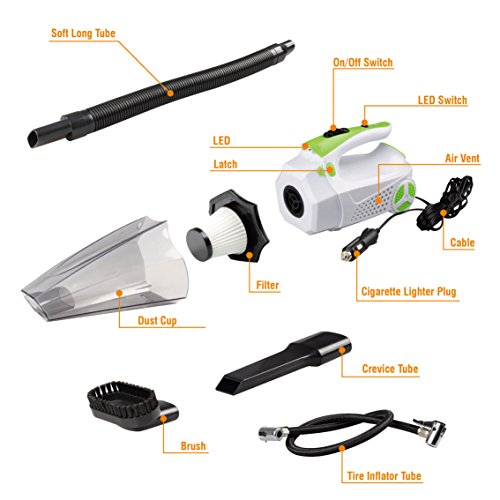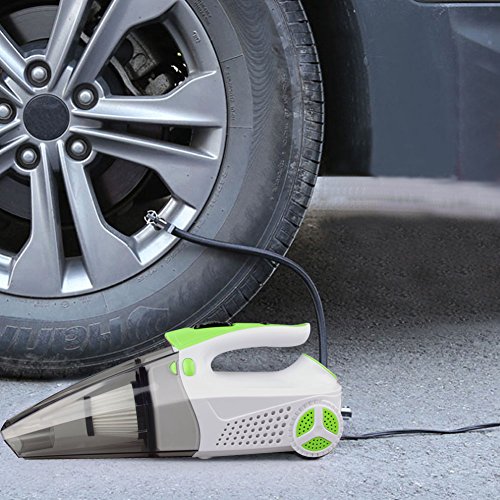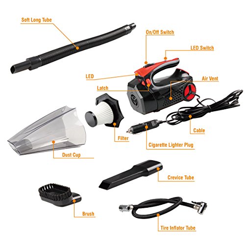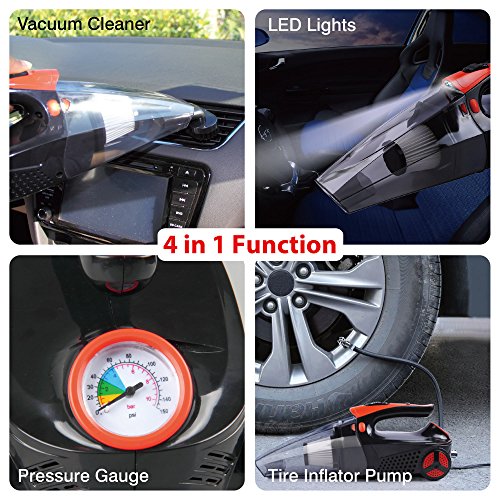 -. Feature : 4 in 1 Multiple Functions : 1. Powerful Wet/Dry 12V 100W Vacuum make it easy to clean the dust, 2. Tire Inflator satisfies your need to inflate tires, 3. Tire Pressure Gauge prevents the over-inflation, 4. Led Light helps lighting in the darkness. / Powerful Suction: 100W power and 4Kpa power of suction make it easy to clean for both Dry and Wet and all surface, with 14.6FT power cord, which access to every corner of your car. / Portable and Eco-friendly: The portable auto vac with removable and washable HEPA filter, which is easy to clean, environmentally friendly and cost saving. And Noise is blow 70db. / Package Includes: 1 x Car Vacuum, 1 x Extension Hose, 1 x Brush Attachment, 1 x Crevice Attachment, 1 x Valve Tube, 1 x 14.6FT (5M) Long Lighter Cable, 1 x User Guide. / Guarantee: If you have any problems, please feel free to contact us, we will try our best to help you within 24 hours.